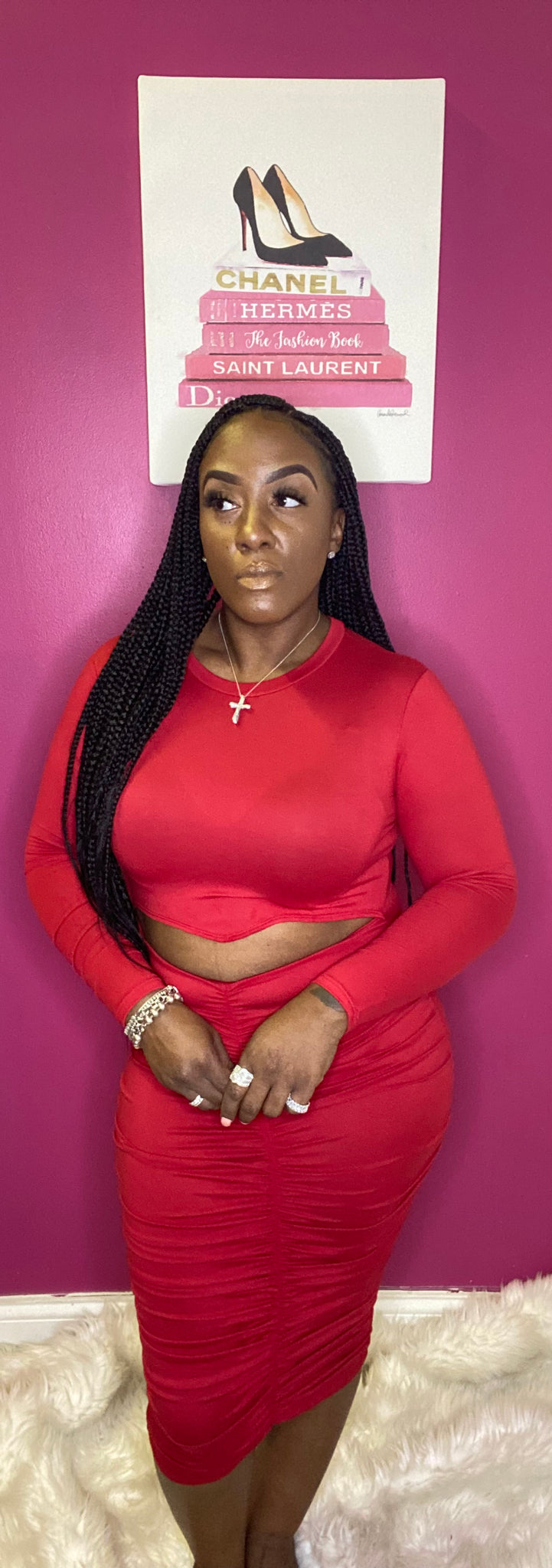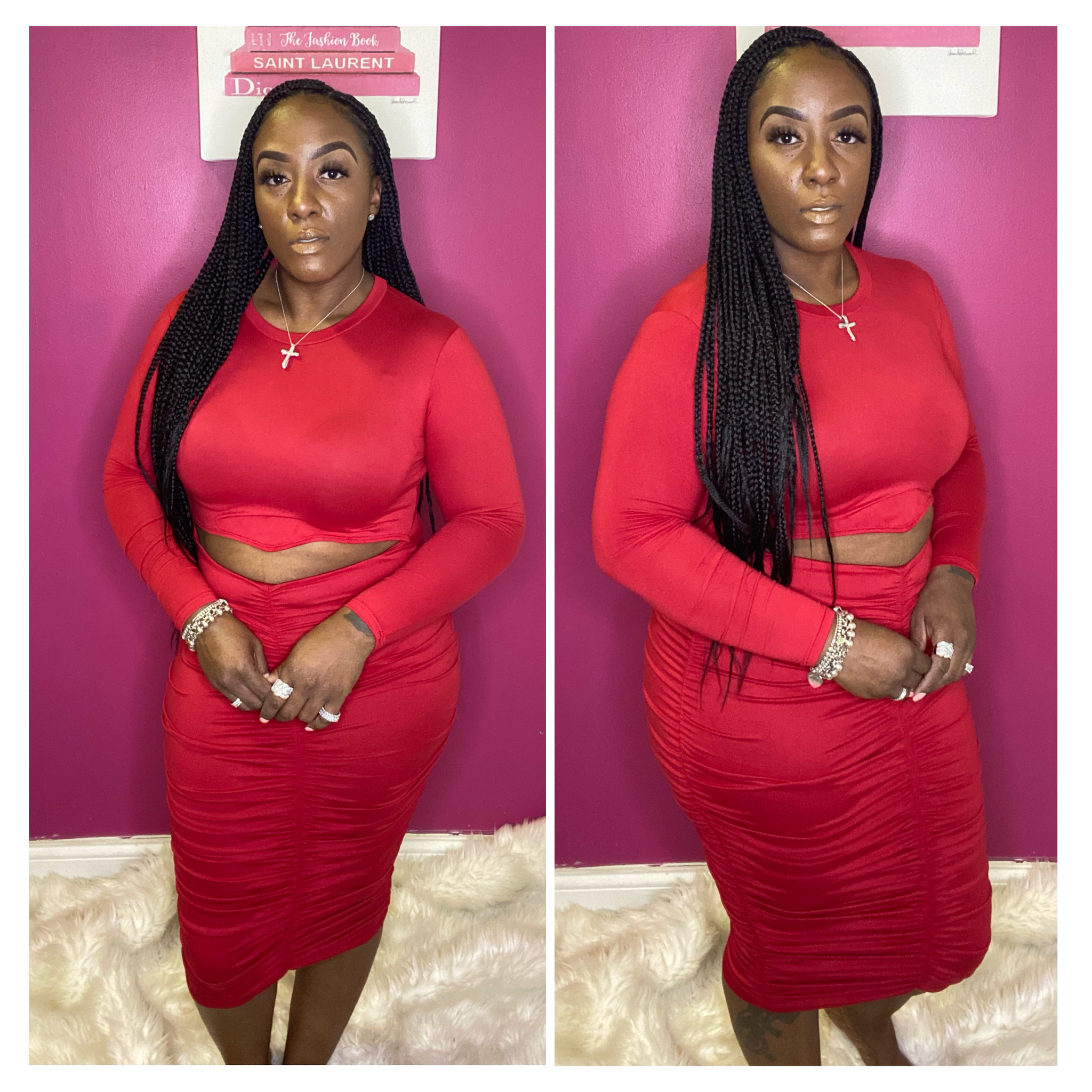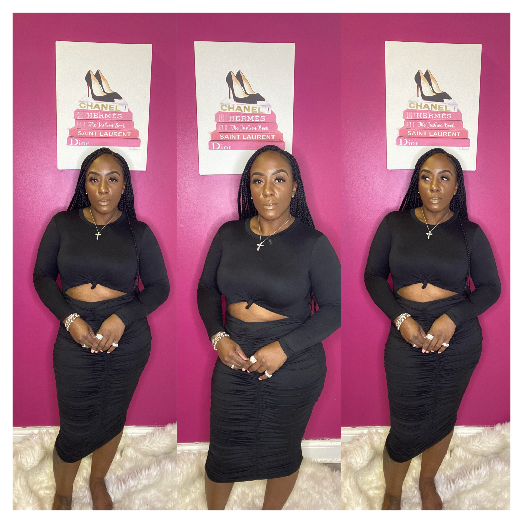 Stretchy solid colored round neck long sleeve dress with opening in the middle and ruched lower half. you can untie the knot or wear it as is.